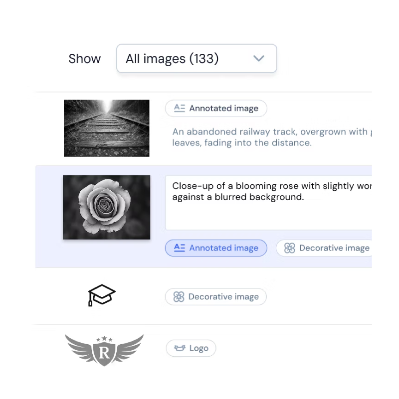Upload your EPUB and find all your images automatically organized in a clear and intuitive interface. Save time and start your descriptions in no time.